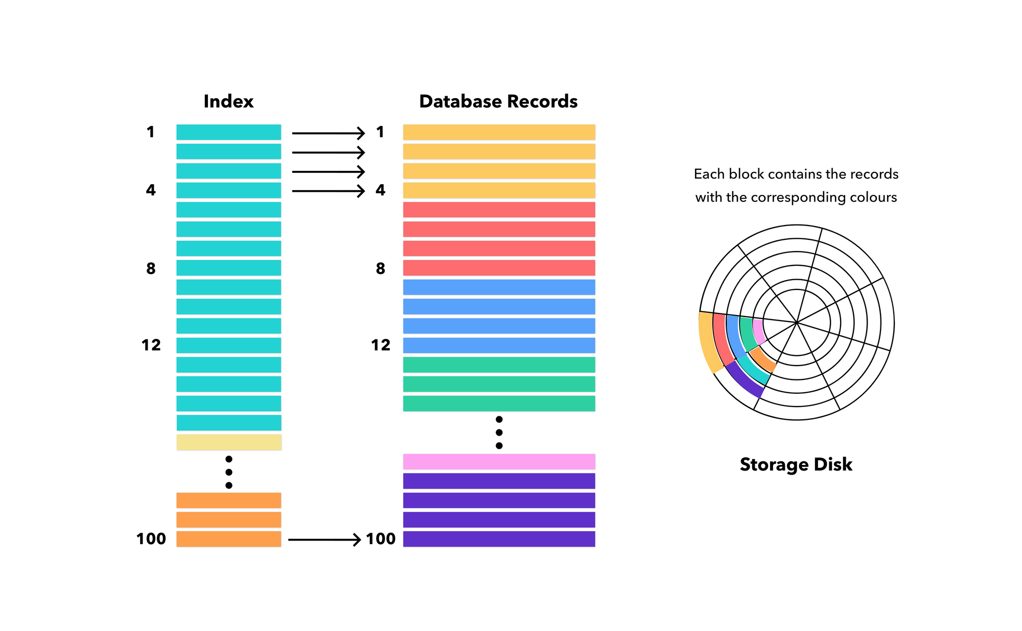 To fix this, we need to have a database for our database. This is called an Index. The index contains the same number of records as the database (100 records) but occupies lesser space.