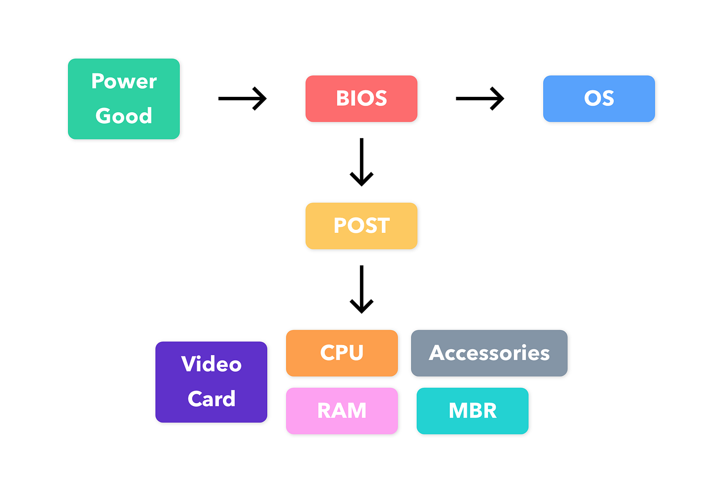 BIOS runs the Power On Self Test (POST) function that checks for the presence of a few things to ensure a smooth boot process. The instructions in this function are stored in the Read Only Memory (ROM) → a tiny chip that contains immutable data (usually fixed by the manufacturer) about the boot firmware. While POST is being run, you can check the monitor for visual and audible cues.