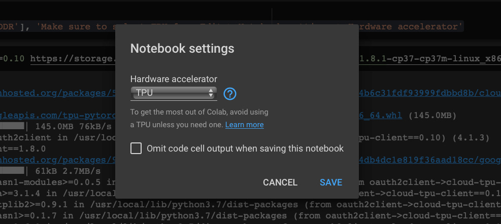 Next, check if the TPU configuration has been acknowledged. This shouldnāt print anything if youāve changed to the TPU runtime.